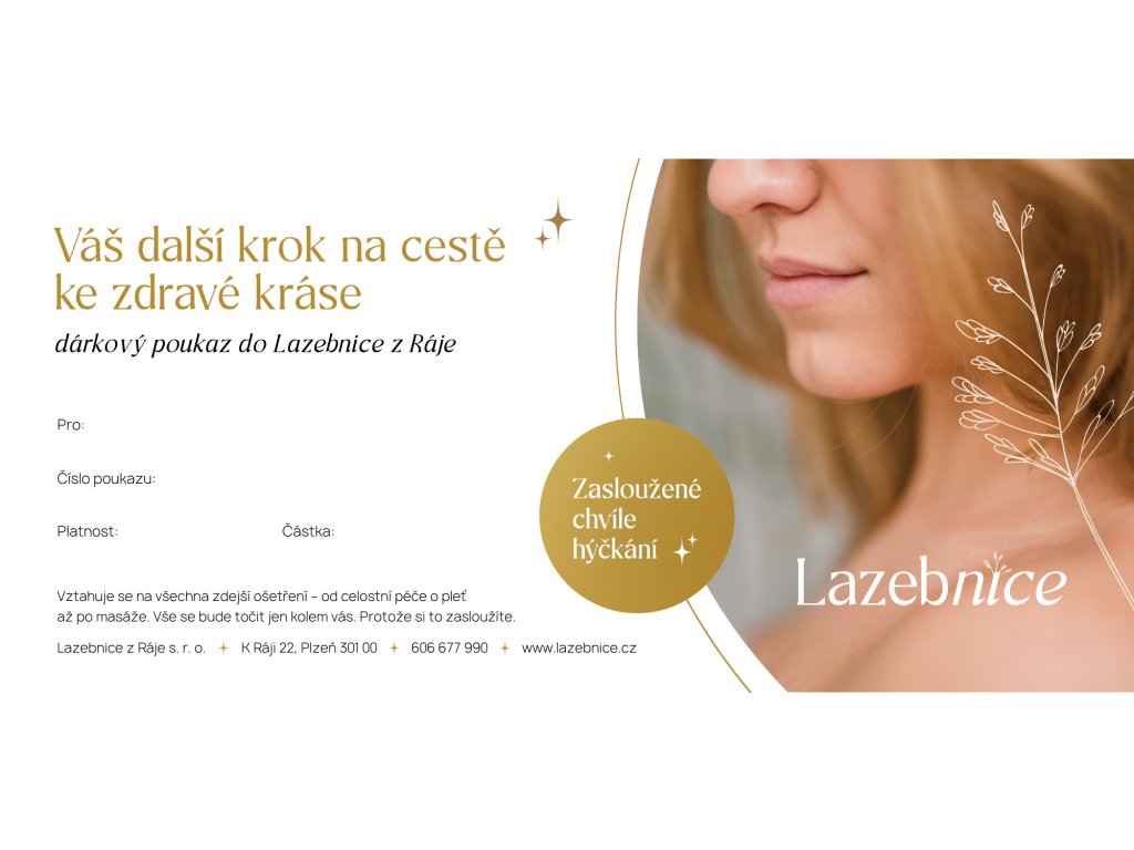 Darujte svým blízkým chvíle péče a relaxace s dárkovým poukazem od Lazebnice. Poukaz "Váš další krok na cestě ke zdravé kráse" lze uplatnit na veškerá ošetření, od celostní péče o pleť až po masáže. Cena poukazu je zcela podle vašeho uvážení, což z něj činí ideální dárek pro každou příležitost. Udělejte radost tím, že darujete čas pro sebe.